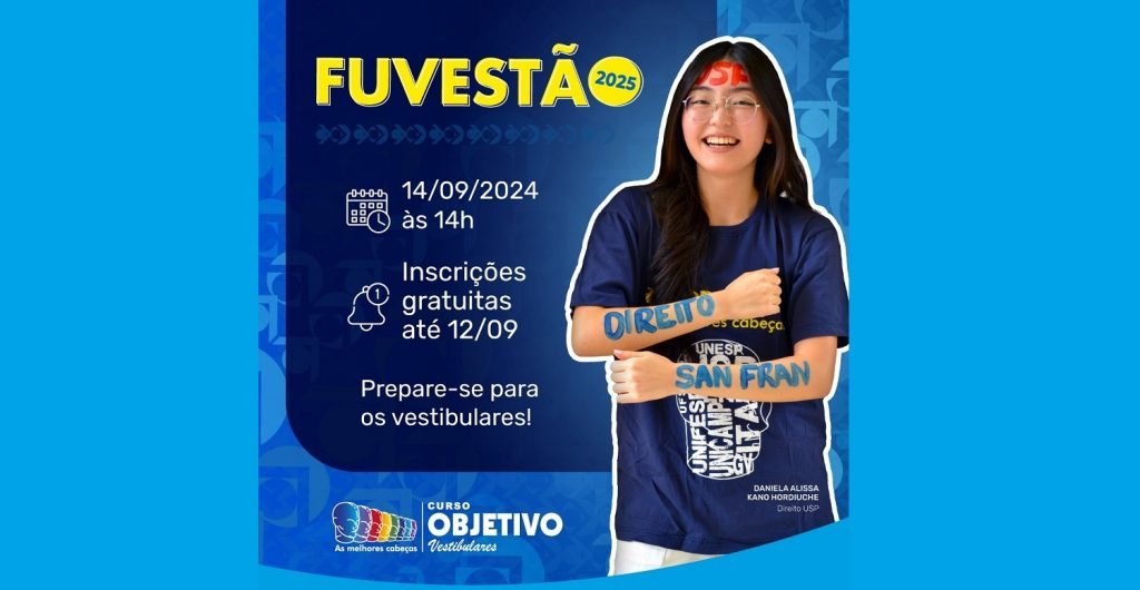 O Curso Objetivo Vestibulares realizará no dia 14 de setembro (sábado), das 14 às 19 horas, o tradicional Simulado Fuvestão. A participação é gratuita, bastando, para isso, inscrever-se até o dia 12 de setembro pelo site www.curso-objetivo.br.