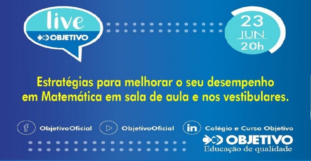 Pensando no assunto, o Colégio Objetivo realizará a live “Estratégias para melhorar o seu desempenho em Matemática em sala de aula e nos vestibulares”. A atividade será transmitida pelas redes sociais da instituição, no dia 23 de junho, às 20 horas, e terá como palestrante Marcelo da Silva Melo que, além de licenciado e especialista em Matemática, é também engenheiro Civil e professor no Curso e Colégio Objetivo.