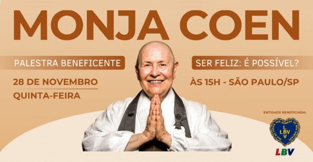 No dia 28 de novembro, às 15 horas, a Monja Coen fará uma palestra beneficente com o tema “Ser feliz: é possível?”, com renda revertida para a Campanha Natal Permanente da Legião da Boa Vontade (LBV) – “Jesus, o Pão Nosso de cada dia!” –, que está arrecadando alimentos não perecíveis a serem entregues em cestas a famílias em situação de vulnerabilidade social atendidas pela Legião da Boa Vontade em São Paulo/SP.