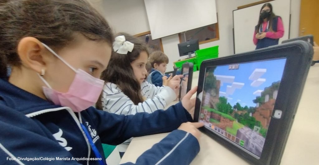 As crianças foram até as salas de Tecnologia do Arquidiocesano para planejar a cidade em um modelo virtual, usando o Minecraft, antes de irem para o projeto físico. O trabalho será feito em várias etapas.