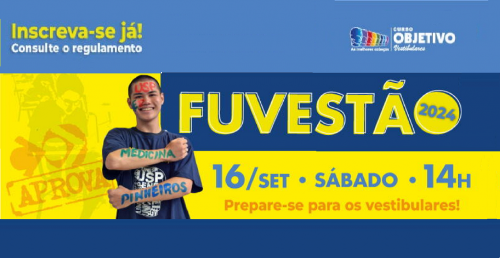 No dia 16 de setembro (sábado), o Curso Objetivo Vestibulares realizará o tradicional Simulado Fuvestão. A prova segue os moldes da 1ª fase dos vestibulares da Fuvest e da Unesp, com 90 testes de múltipla escolha. A participação é gratuita. No Fuvestão, o estudante testa os conhecimentos e enfrenta os vestibulares com mais tranquilidade e segurança.